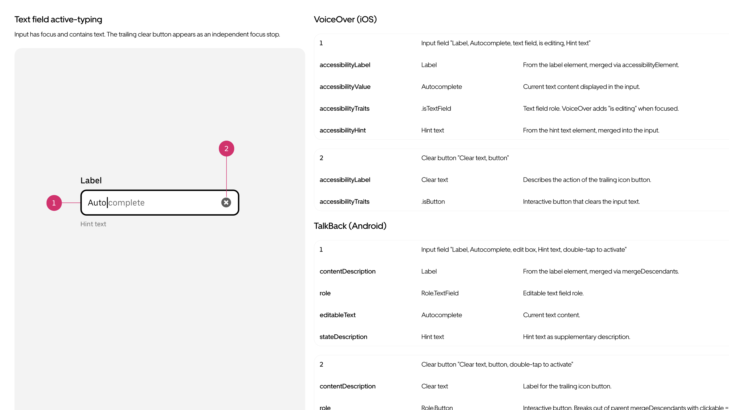 That’s one spec with six sections, and only the implementation side. The screen reader section alone covers three accessibility APIs, each with hundreds of properties: VoiceOver modifiers and traits, TalkBack semantics, and ARIA roles and states. Writing it correctly means selecting the right values from platform documentation. Designers spend hours cross-referencing references, and a single wrong property means a broken experience for assistive technology users